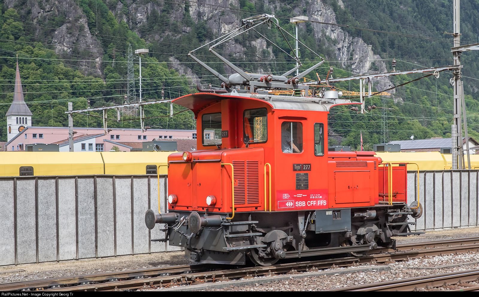 Small electric shunter with additional diesel motor, Tem II # 277, of SBB Historic in Erstfeld. Built in 1967 by Tuchschmid, SLM and MFO, with 125 kW when running from the overhead wire and 60 kW in diesel drive. This day, there were the first "fitness runs" after the Corona shut-down. Every first saturday of each month, the operational vehicles of SBB Historic Erstfeld are moving through the station, open for the public, to avoid standstill damages and to keep experience for the engineers.