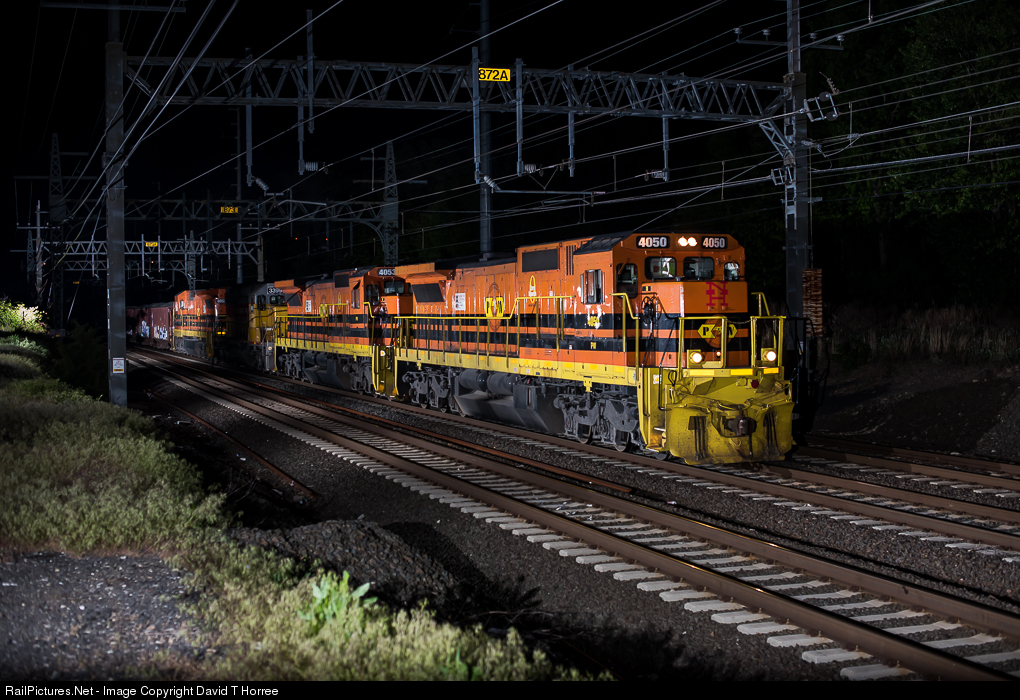 C40-8 4050 leads two other C40-8's and Connecticut Southern SD40-2 3399 under the canopy of overhead wire on Metro North's New Haven Line at CP 261, in Devon, Connecticut. Devon is located on the west side of Milford, Ct., and is the junction with the Waterbury Branch and a movable bridge over the Housatonic River. The train has 97 loads of stone for interchange to the New York and Atlantic in Fresh Pond in Queens, NY., after traversing the "Hell Gate Bridge Route".