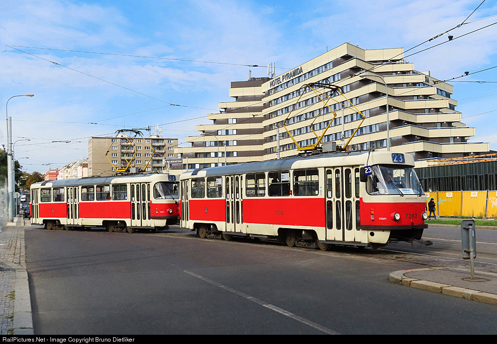 | Old and new: Tramway Oldie line 23 runs to the departure station Malovanka, in the background the new building Hotel Pyramida. This beautiful oldie runs until the final station Zvonarka |