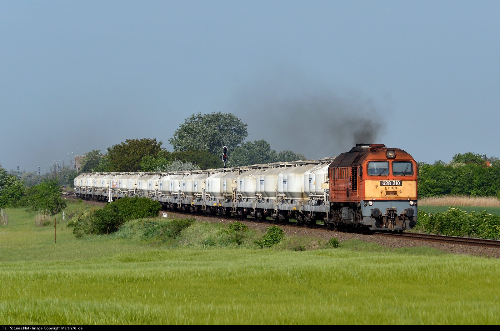 | The diesel locomotive 628.210 hauling a freight train from Székesfehérvár to Pusztaszabolcs passed the station Zichyújfalu.