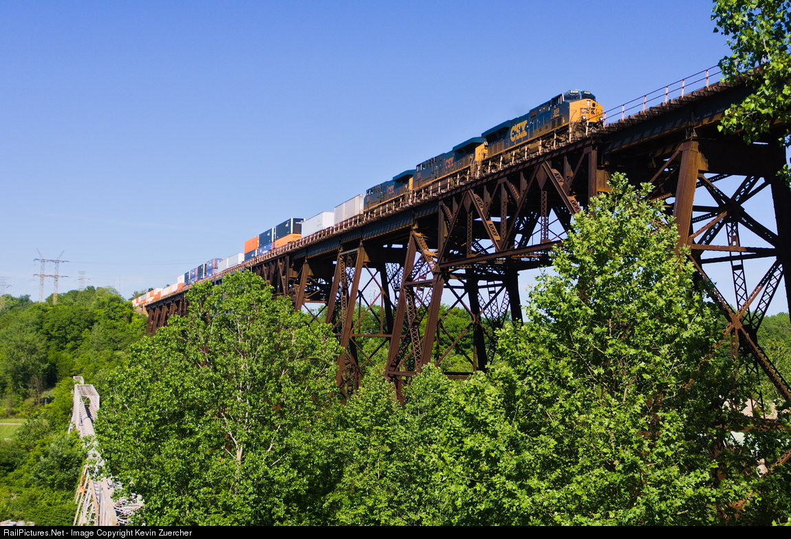 A westbound CSX intermodal train soars high above the landscape below, crossing the "Marcy Trestle" just outside of Cleveland, Ohio. The trestle was built in 1907 for the New York Central Railroad. Freight traffic in Cleveland had become highly congested in the early 1900's, and even through-freights experienced significant delays. So, the NYC built this trestle as a bypass for trains not destined for the city and its surrounding areas. Today it is part of CSX's busy mainline connecting the east coast to Chicago and the railroads of the west.