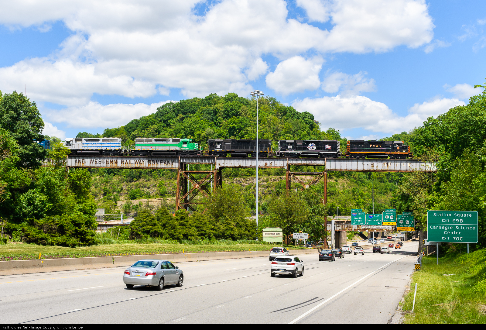 | With P&WV painted GP35 WE 101 on the point of a colorful consist of 5 EMD's, Wheeling & Lake Erie train 218 crosses over I-376 on a former Norfolk & Western trestle as it heads out of Rook Yard with freight bound for interchange with the AVRR in Bruceton. |