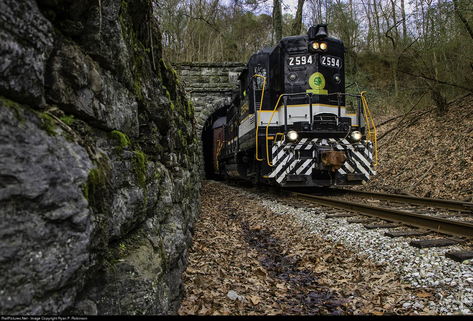 | Southern Railway GP30 2594 pops its head out of the East portal of Missionary Ridge Tunnel with TVRM train 100, the "Missionary Ridge Local", bound for Grand Junction Station. 2594 is leased from the Southeastern Railway Museum in Duluth, Ga. and is seldom used by TVRM since a fee has to be paid to SERM everytime the locomotive is started up. |