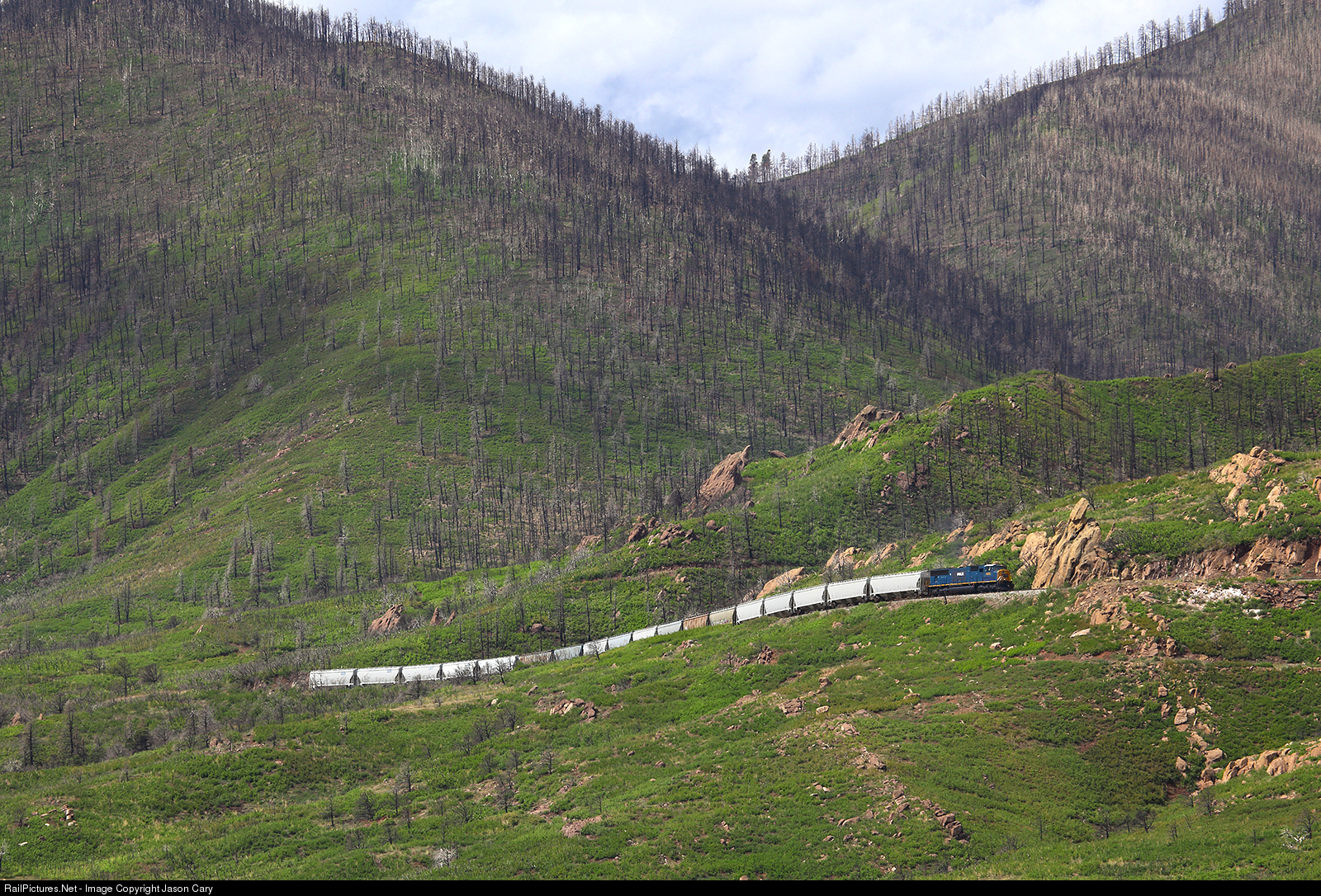 | La Veta Pass A westbound train of 18 empty hoppers heads up the 3% grade above Occidental. The DRGW rated any given locomotive for less tonnage here than on Tennessee Pass. The Spring Creek fire of 2018 destroyed 108000 acres and was the third largest fire in Colorado history. The forest is already beginning to re-bound with fresh green slopes. |