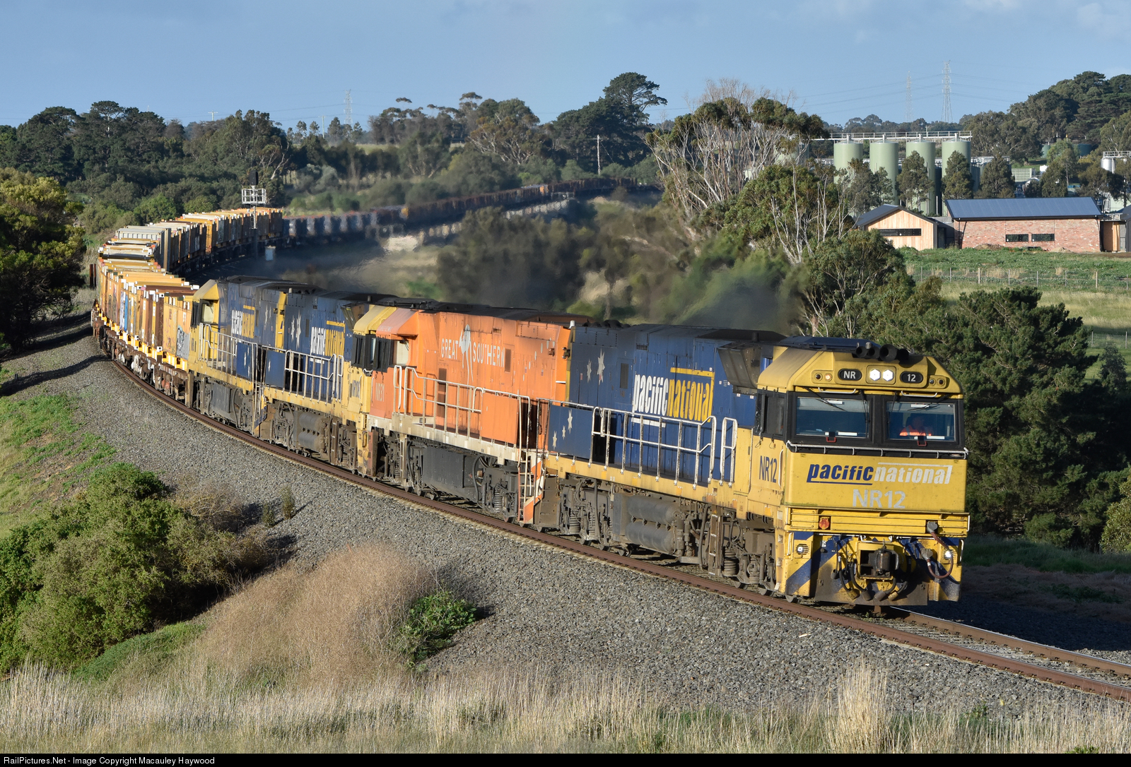 | Perth bound steel train 5MP2 with quad NRs at the helm is seen under throttle on the approach to Gheringhap. Amongst the locos is one of the 'Great Southern' livieried NRs. |