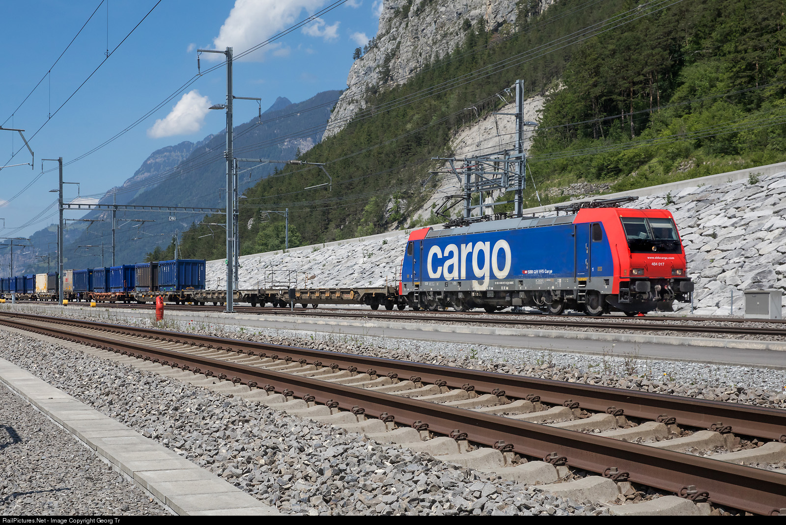 | Bombardier TRAXX F140 MS Re 484 # 017 of the SBB Cargo International, built in 2004, is pulling the southbound intermodal train 42051 from Singen (Hohentwiel)/Germany to Montirone/Italy (near Brescia) towards the Gotthard Base Tunnel at Rynächt near Erstfeld. |