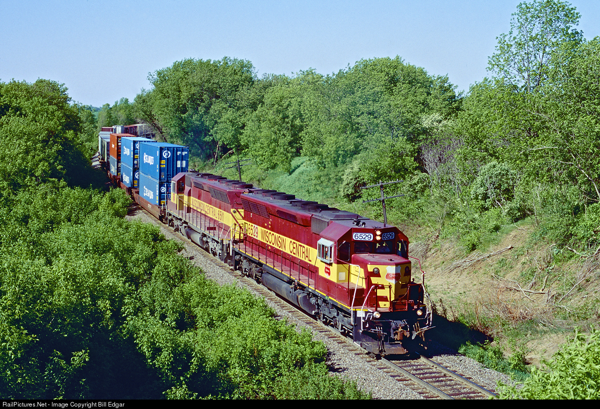 WC SD45s 6529 and 6511 grind a stack and intermodal train up Byron Hill at Hwy. F after leaving North Fond du Lac for Chicago. This scene is now double track, part of CN's mainline through Wisconsin between Duluth, MN and Chicago. WC 6529 was renumbered from 6553, former BN 6553, built Nov. 1971. WC 6511 would become 7510, former BN 6511, built June 1971.