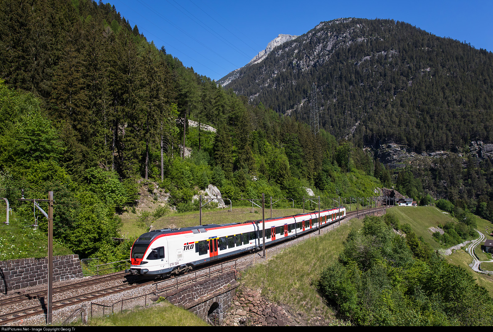 | "Flirt" RABe 524 # 109 of the TILO (Treni Regionali Ticino Lombardia, a 50 % daughter of the SBB and 50 % of the italian TreNord) is running the Regio Express 4308 from Chiasso (covid-19 timetable not from Milan) via Lugano-Bellinzona-Airolo-Göschenen to Erstfeld, over the Gotthard mountain line above Wassen. From the chance of timetable in december of this year, the Südostbahn will run this service with the new TRAVERSO trainsets, then between Basel/Zürich and Locarno. |