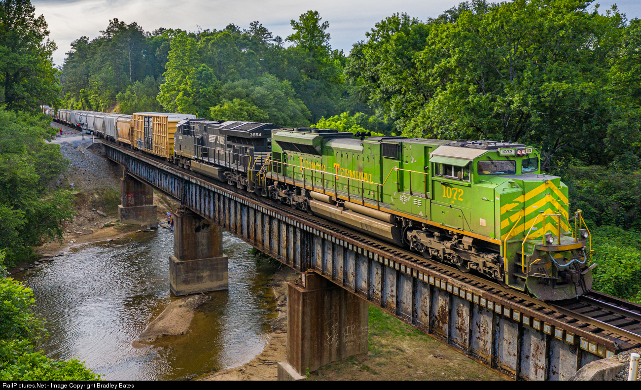 | Norfolk Southern's Illinois Terminal Heritage Locomotive #1072 leads Train 186 East as they cross the Tallapoosa River in Tallapoosa, GA. |