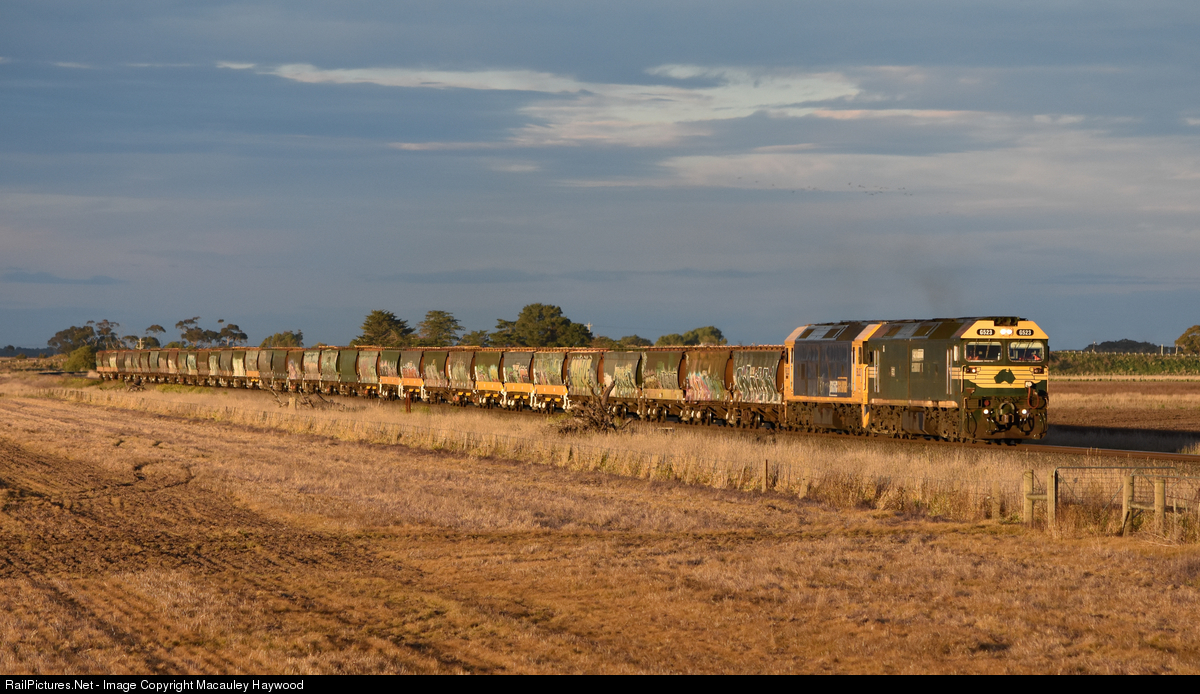 | Sporting the old Freight Australia green and gold livery, G523 at the helm of Pacific National 7737V empties, along with BL32 power away from Gheringhap, catching some brilliant late afternoon light whilst the sun sits on the horizon. |