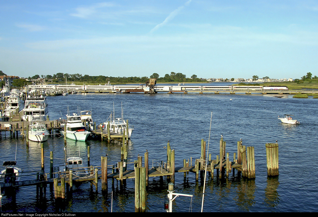 | Starting in 2014 and 2015, New Jersey Transit began introducing to the rail schedule select trains that ran directly to/from New York Penn Station for passengers below Long Branch. Here is a rush-hour Penn Station New York to Bay Head express train crossing the Manasquan River. |