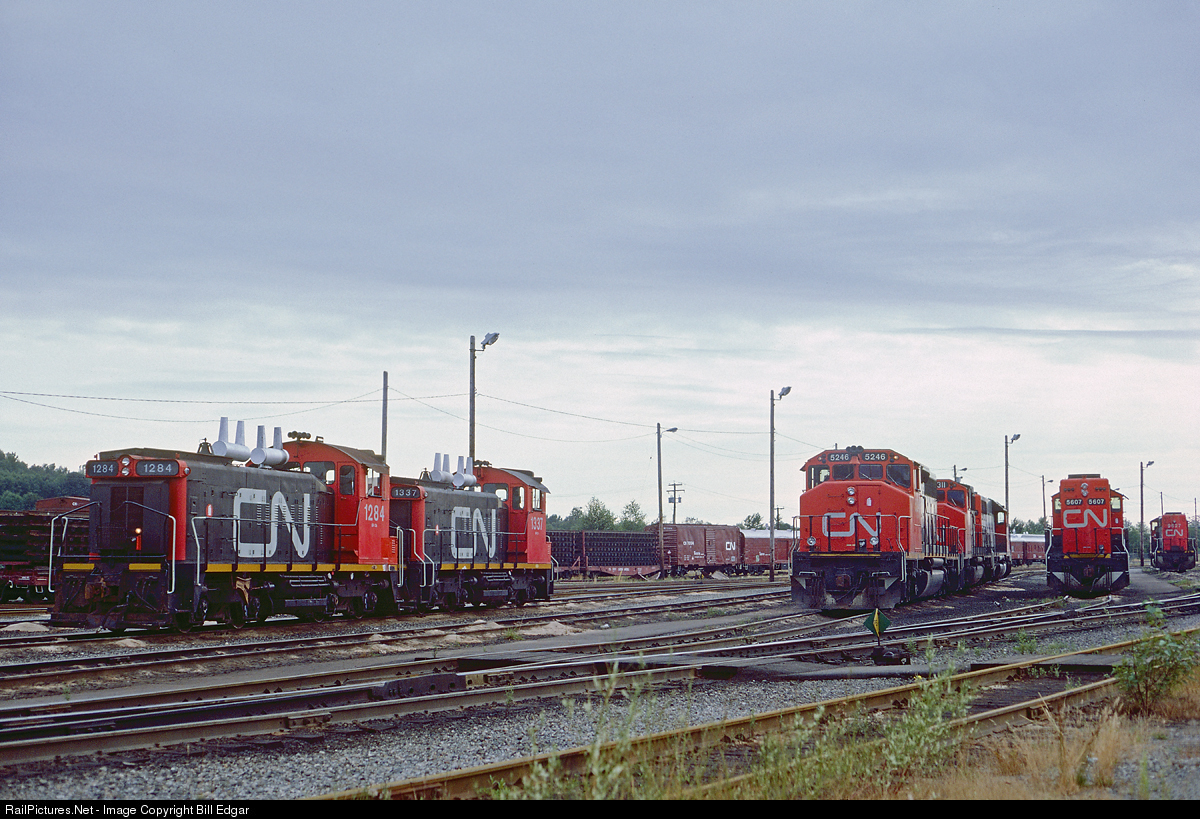 | CN SD40-2W no. 5246 surrounds itself with a variety of yard and road power at Thornton Yard in Pt. Mann, BC. This facility is CN's primary classification yard and locomotive shops in the Vancouver area. Entry from here into Vancouver and North Vancouver require use of trackage rights over BNSF, dating back to Great Northern Ry. ownership well over 100 years earlier. |