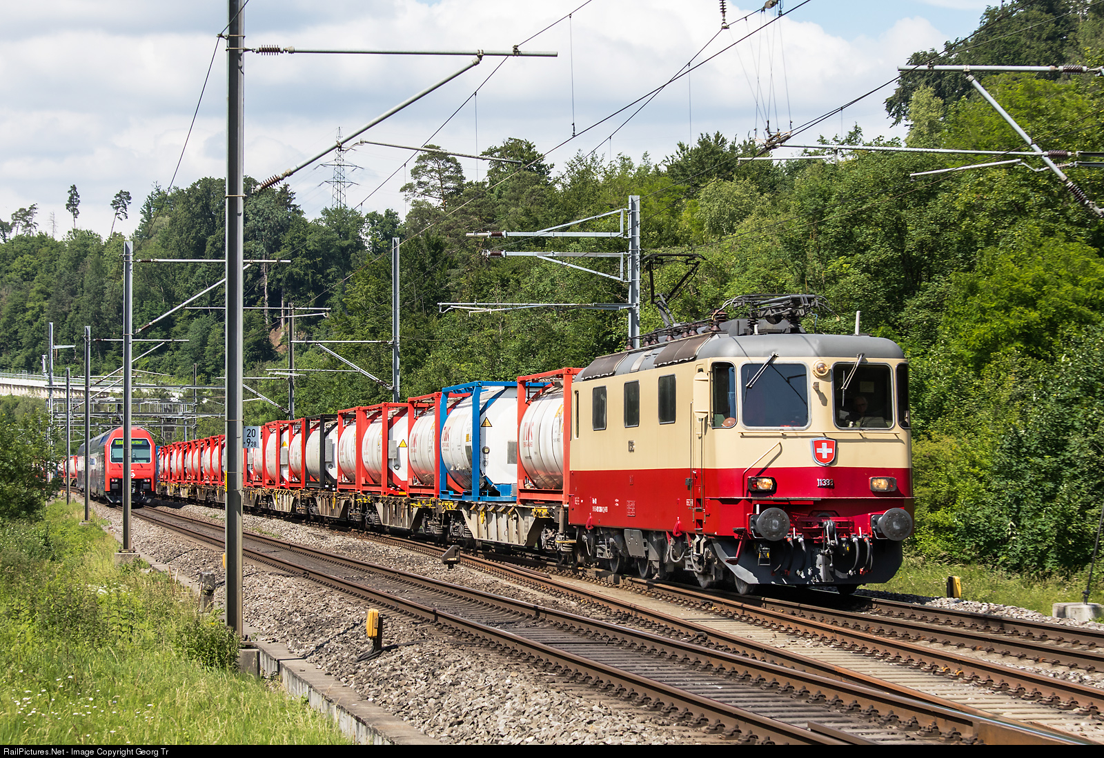 | Re 421 # 393 (Re 4/4 II # 11393) of the IRSI (International Rolling Stock Investment Gmbh) is pulling train 69462 of TR TransRail with 24 Sgns container cars with empty tank containers from Islikon (Swiss Sugar) via Winterthur-Kloten.Regensdorf-Brugg-Olten VL to Frenkendorf-Füllinsdorf (container terminal), running through Kemptthal. |