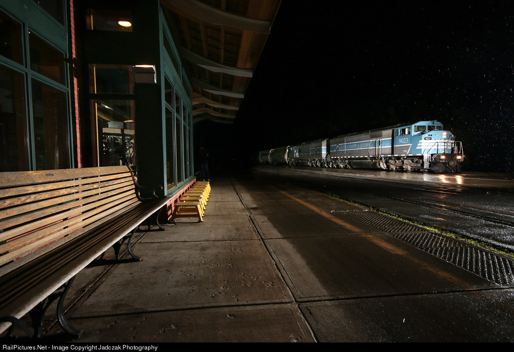 Two CMQ barns lead CP train 253 north out of Saratoga Springs, passing the Amtrak station as the rain begins to come down.