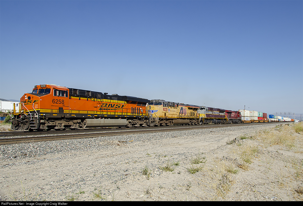 Displaying one of the more interesting locomotive lashups to show up in southern California in a while is BNSF Railway train Z-LACALT7-11, the power for which represents three railroads and four paint schemes! BNSF ES44AC 6258 is leading Union Pacific ES44AC 8235, Canadian Pacific "Heritage" SD70ACU 7014 and Canadian Pacific ES44AC 8751. (CP's SD70ACUs are rebuilt SD90MAC locomotives.) The train is passing through Verdemont, at the base of Cajon Pass, and is heading from Los Angeles to Alliance, Texas. (San Bernardino, California – June 11, 2020)