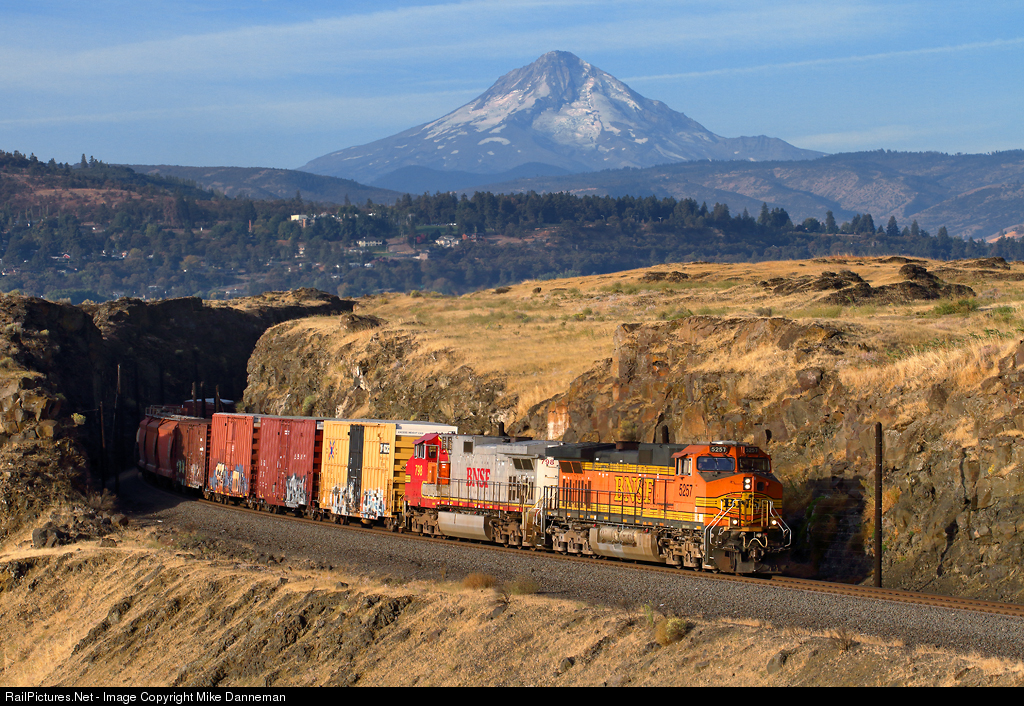 An eastbound BNSF freight, powered by a pair of GE C44-9Ws, curves out of Dallesport, Washington, on the morning of September 29, 2016. Mount Hood stands prominently in the background at this location on BNSF’s Fallbridge Subdivision along the Columbia River.