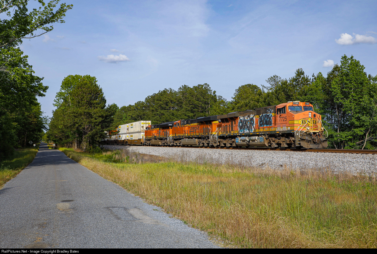 | BNSF ES44DC #7725 leads Northbound CSX Intermodal Train Q186-16 through Coosa Pines at Grasmere, AL. Apparently this locomotive had been sitting somewhere for awhile with all the graffiti seen on it. |