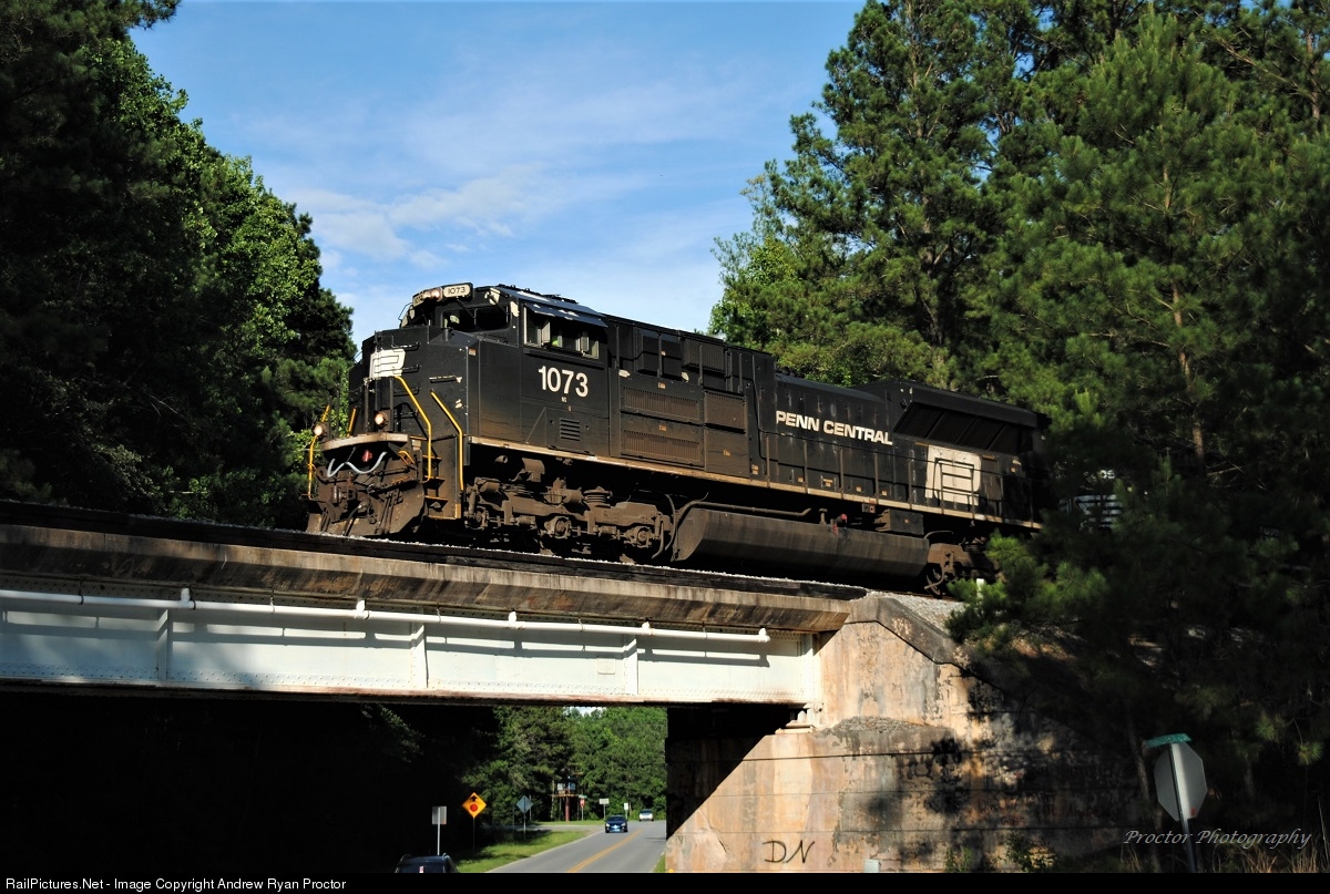 | NS 373 heads towards Macon, Ga and so far to Birmingham, AL with NS 1073 "Penn Central" heritage unit leading the way. |