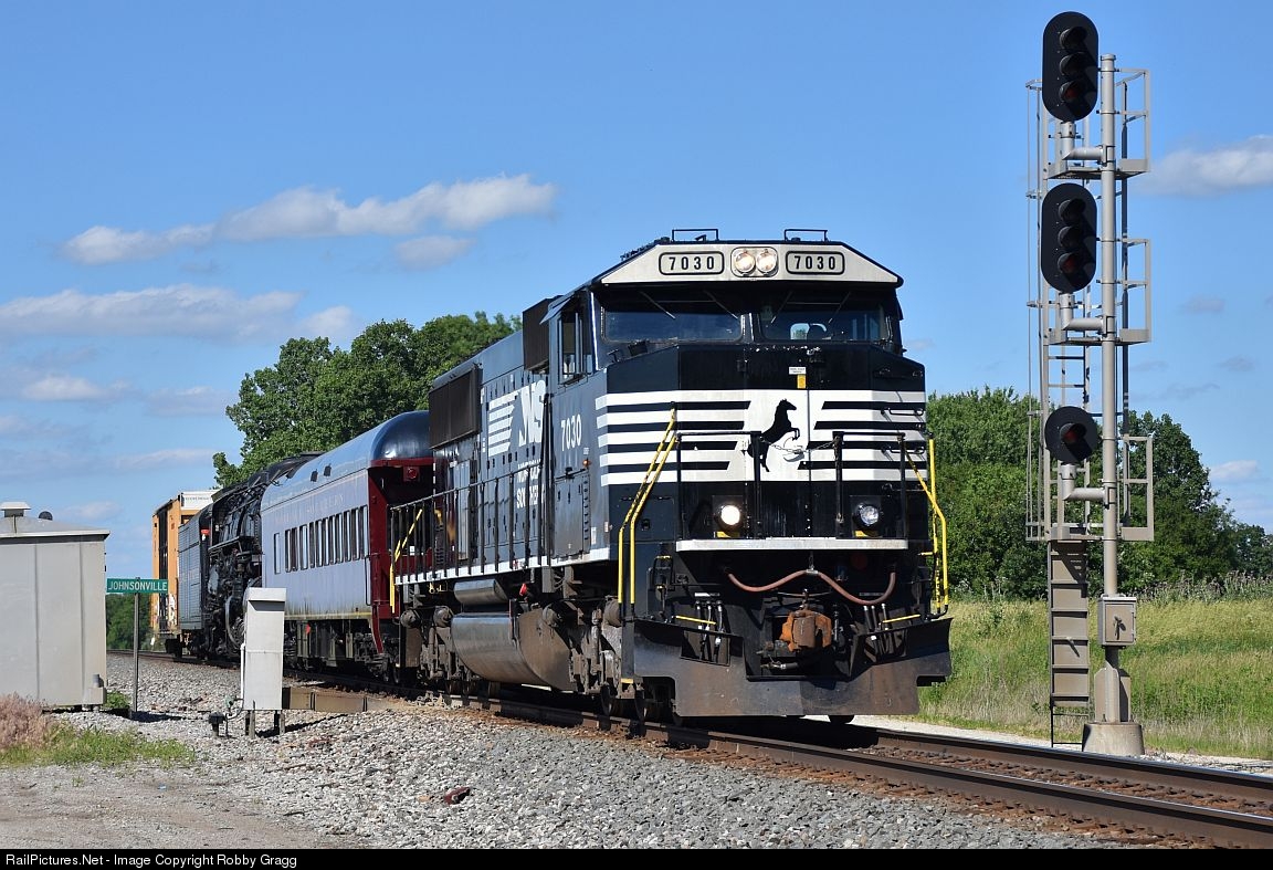 | NS SD60E 7030 tows the N&W 2156 west through the small town of Johnsonville. The 2156 is heading back to the St. Louis Museum of Transportation after a 5 year loan to the Virginia Transportation Museum in Roanoke, VA. |