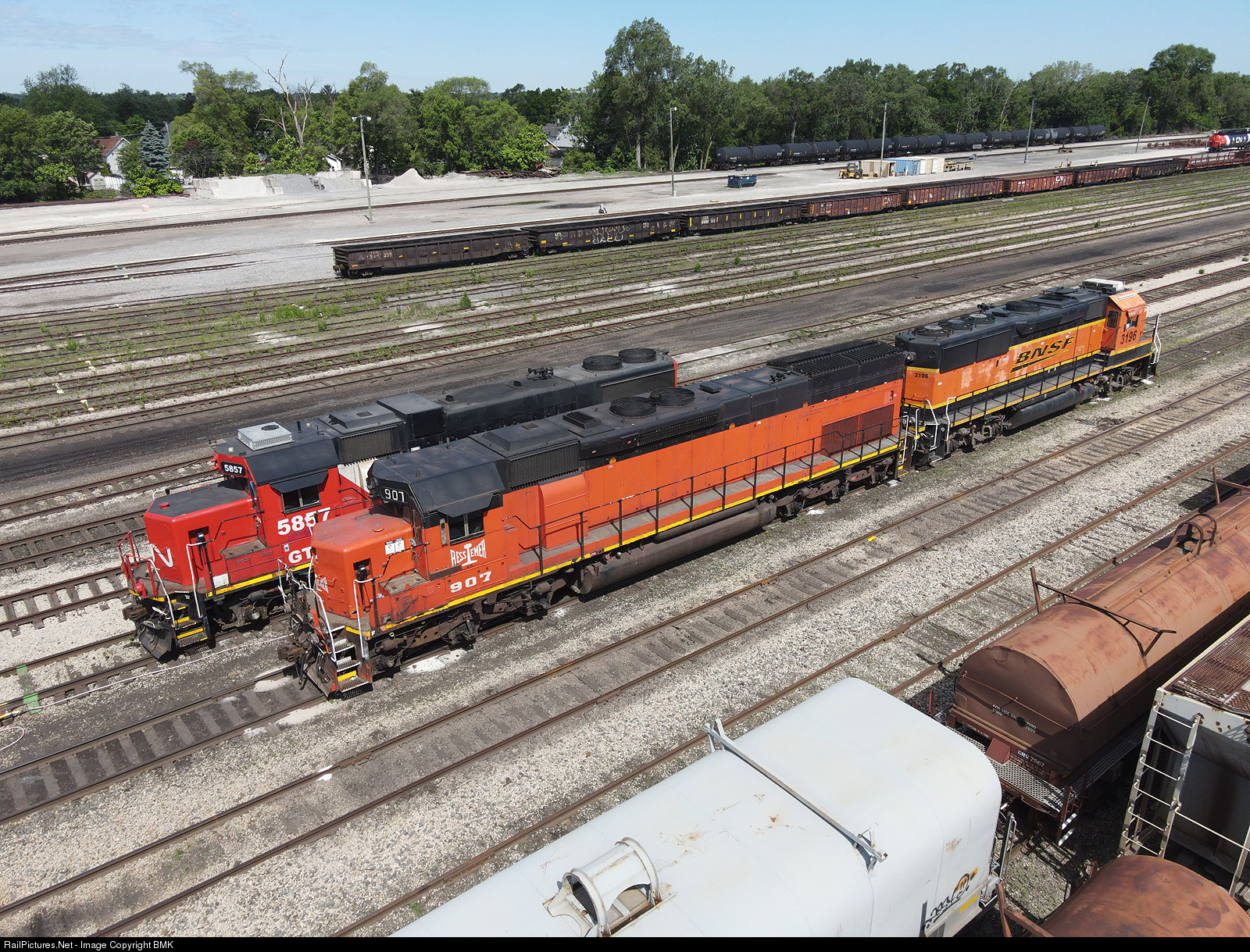 This was worth getting the drone up for. BLE 907 and BNSF 3196 are parked after arriving the day before on the L595. BLE 907 ended up going back to Gary later in the day after its short visit to Joliet.