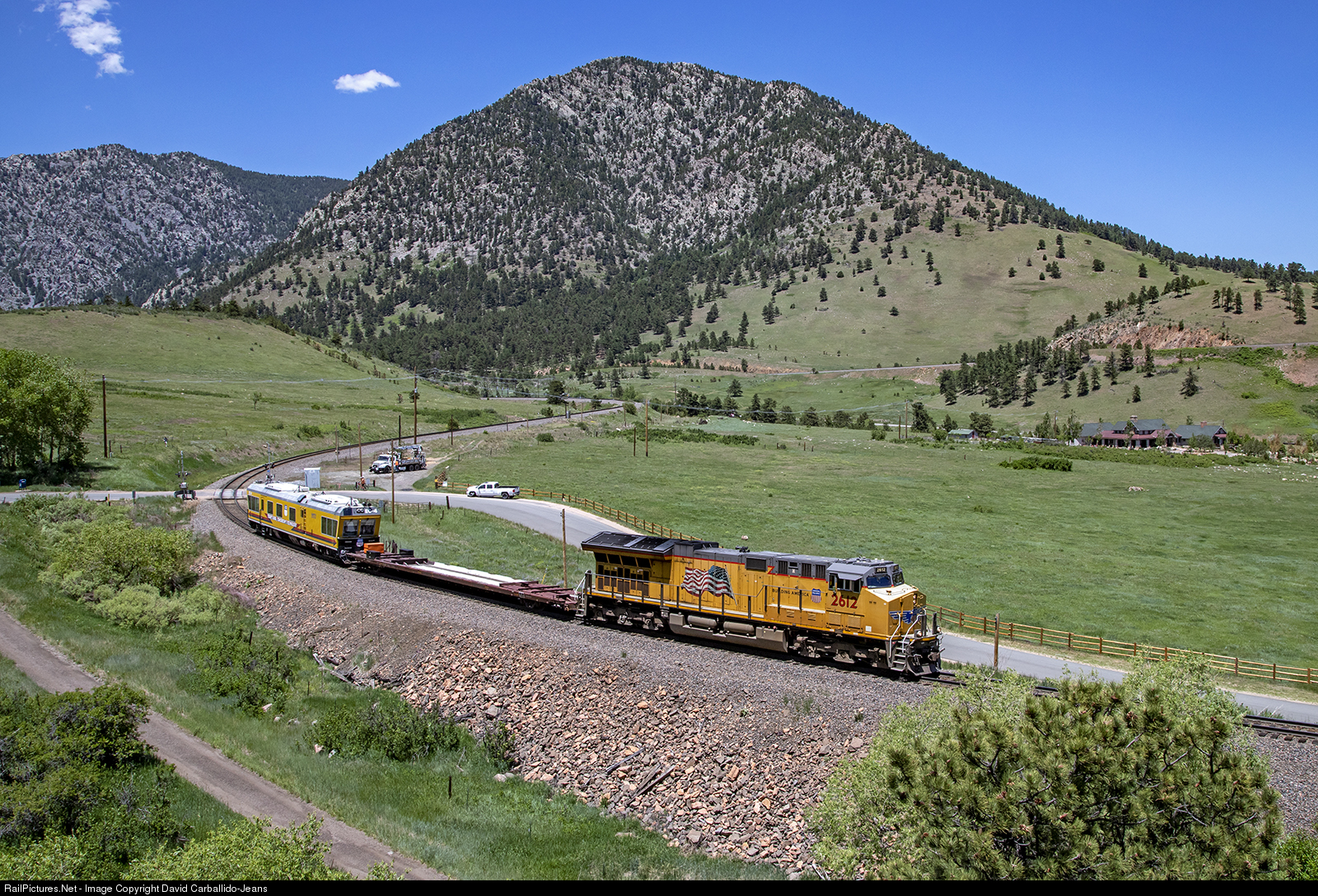 A lone GEVO leads the EC-4 car special down the eastern slope of the Colorado Rockies on warm summer afternoon. The EC-4 car inspects the tracks, looking for defects, as a hy-rail vehicle follows closely behind the train.