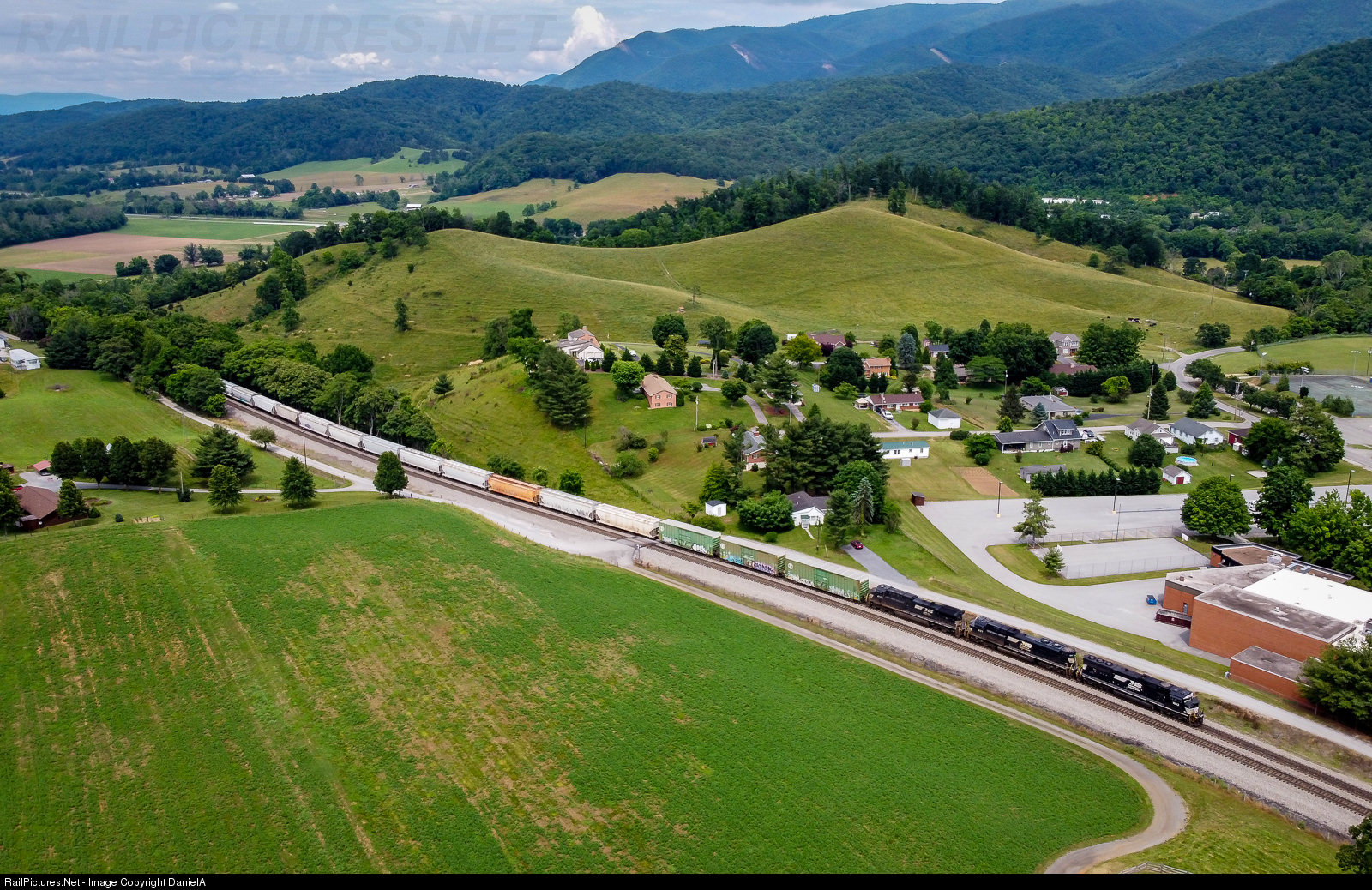 | Seen from high above Shawsville, Va from a drone, NS 195 slowly climbs Christiansburg grade with a new SD70ACC rebuild on point. |