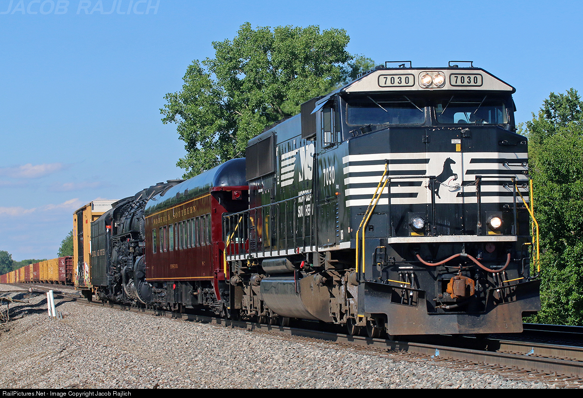 | NS 7030 leads NS 957, a special ferry move for N&W Y6a 2156 returning to Saint Louis from Roanoke, out of Tilton Yard. |