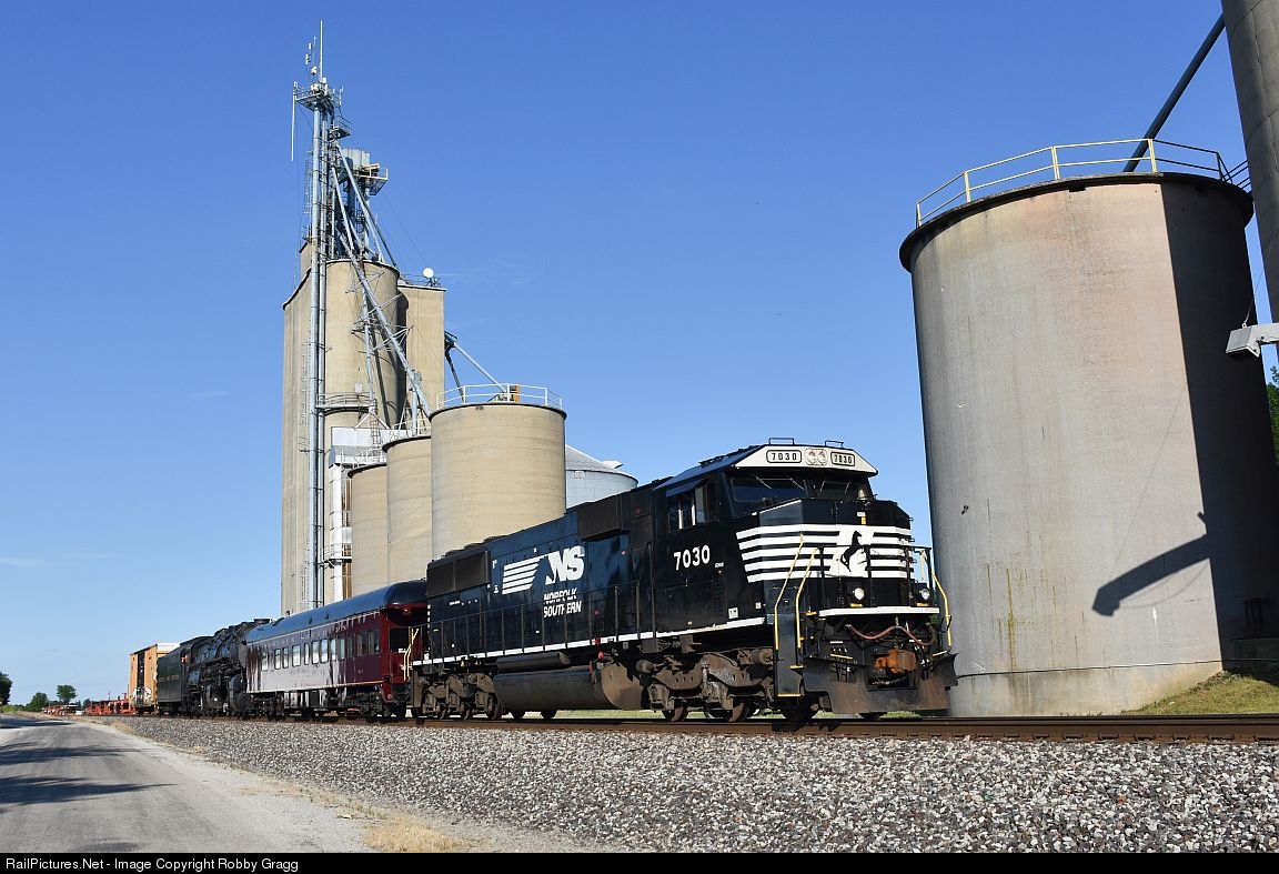 | NS SD60E 7030 tows the N&W 2156 west through Philo. The 2156 is heading back to the St. Louis Museum of Transportation after a 5 year loan to the Virginia Transportation Museum in Roanoke, VA. |
