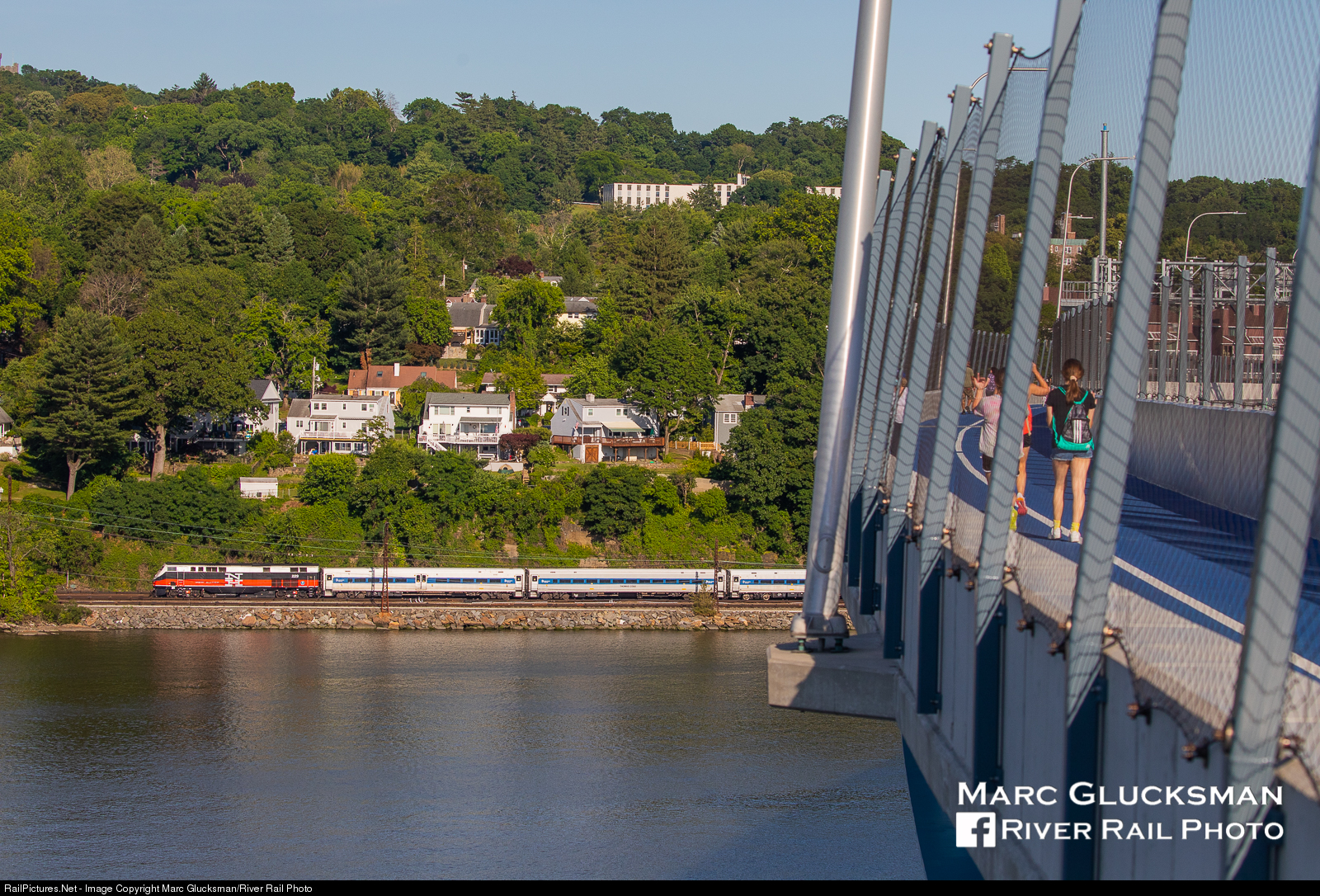 Walking on water. The 3.1 mile pedestrian and bike path on the new Tappan Zee Bridge (some call it the Gov. Mario Cuomo Bridge) was open for its first full day on Tuesday, June 16, 2020. Seen from the “Tides Of Tarrytown” viewing area (one of six on the bridge) MTA Metro-North Railroad 229 (P32AC-DM, New Haven Tribute) powers a Grand Central Terminal bound consist.
