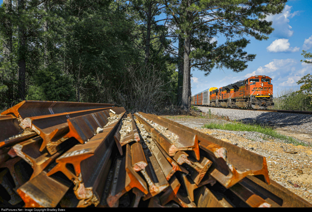 BNSF Auto Train V-BIRWEL1 heads north as they pass by a stack of old rail at Townley, AL.