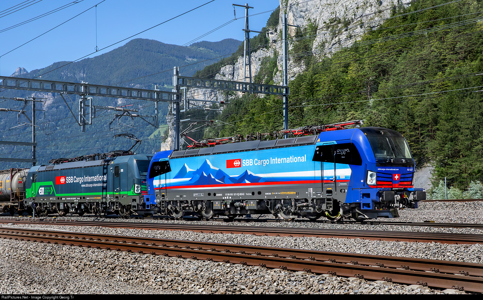 Siemens "Vectrons" 193 # 527 "Main" of SBB Cargo International, rented from the SüdLeasing Gmbh, with 193 # 257 of the ELL (European Locomotive Leasing) in multiple control, are pulling the southbound intermodal train 40245 from Antwerpen-D. S. Oorderen/Belgium to Gallarate/Italy (Busto Arsizio Terminal) towards the Gotthard Base Tunnel at Rynächt near Erstfeld.