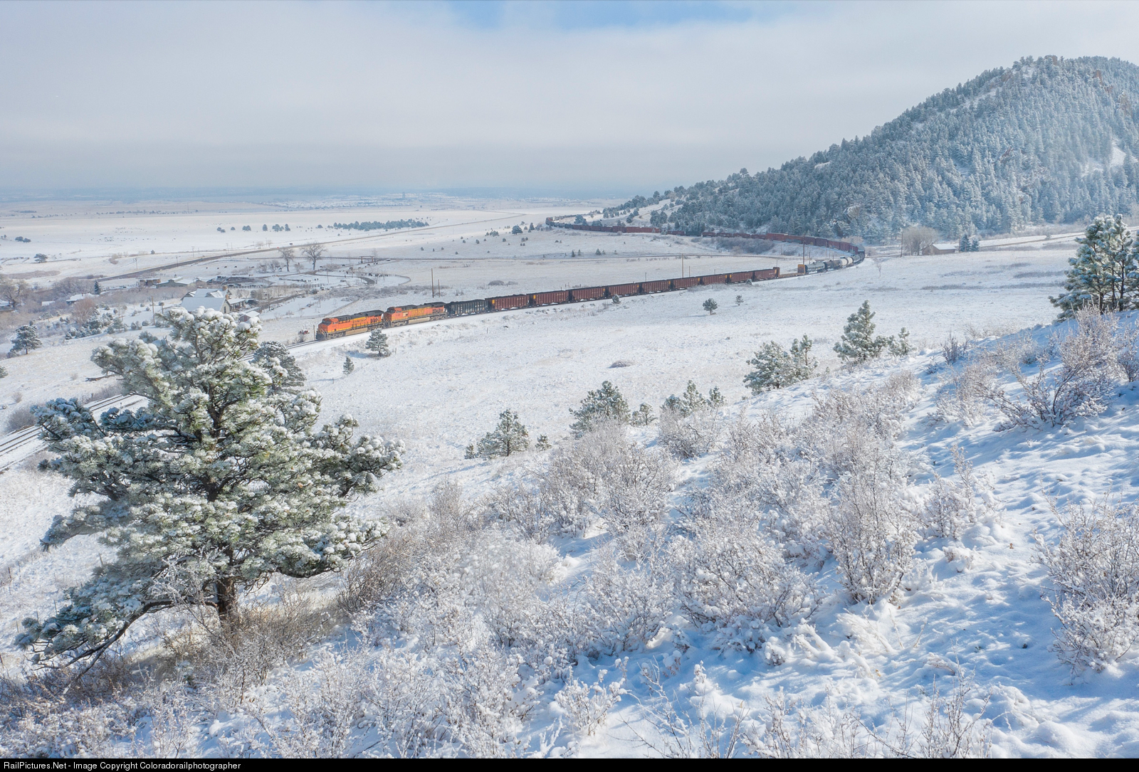 BNSF 8231 is at Blue Mountain on a most delightful sunny snowy morning in between the clouds of a fast clearing snow system near what used to be Clay, now Eisele. Down in Denver, CO it’s still snowing. |
