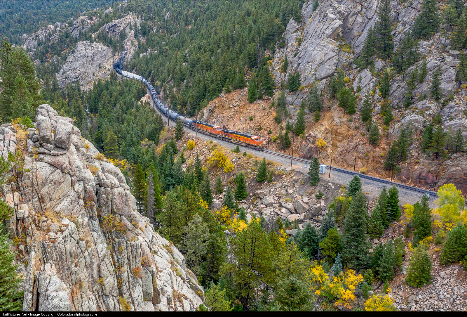 BNSF 7350 is handling tonnage near tunnel 27 in the heart of the tunnel district. Fall color dots the canyon around South Boulder Creek.