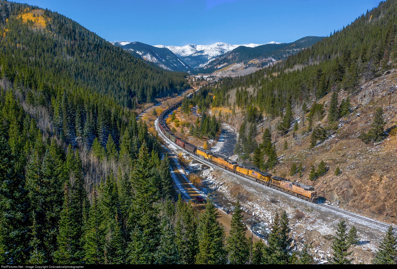 Fall color mingles with fresh snow along the picturesque curve over South Boulder Creek east of Tolland, CO. The Great Divide is majestic as always bring this scene together a very Moffat Road scene. Union Pacific 5671 leads the MGJNY into the canyons which lead to Rollinsville and eventually Denver.