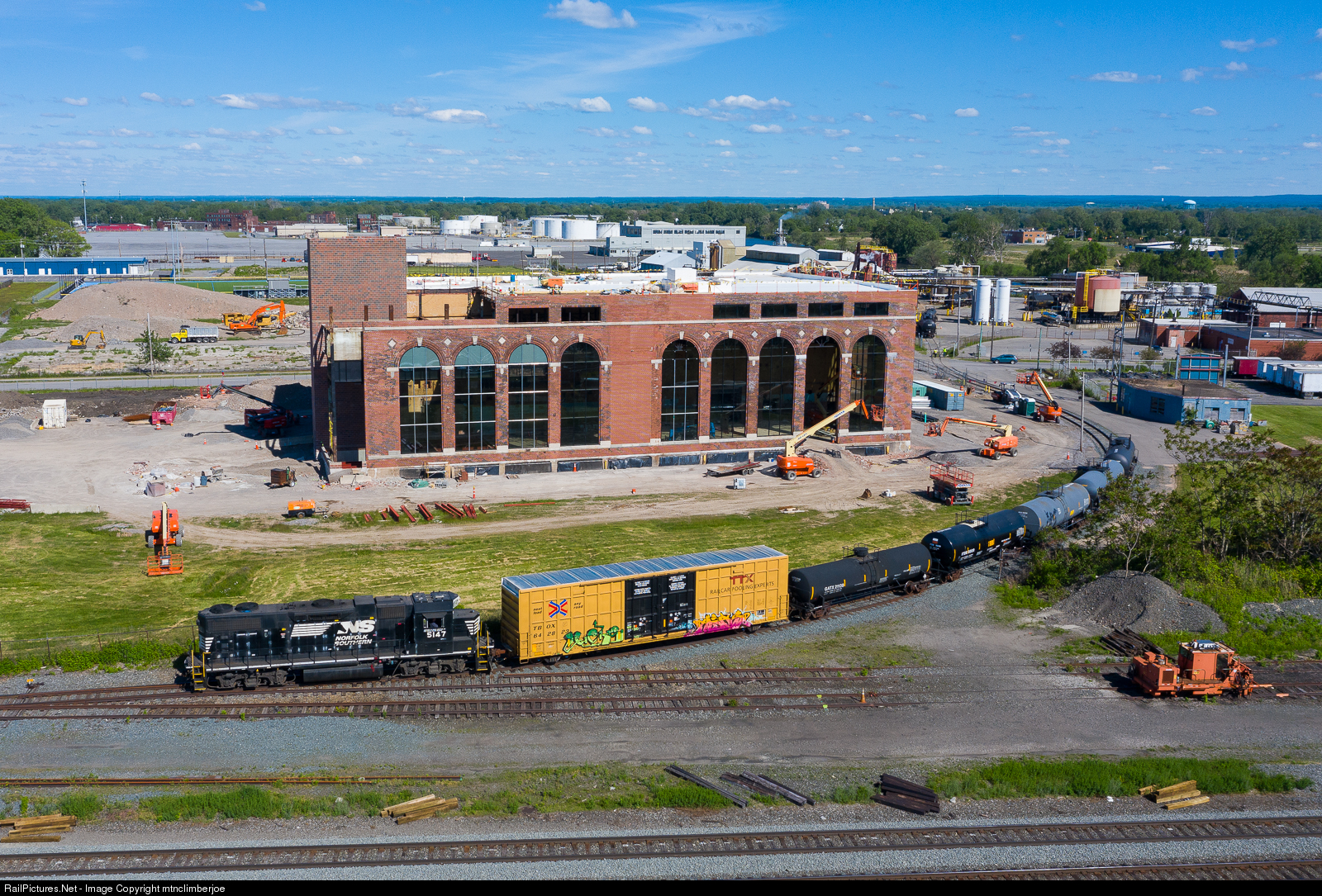 Norfolk Southern local C87 has finished switching work at PVS Chemical Solutions ad is pulling back towards the Ebenezer Runner to allow the conductor to close and lock the gates at the facility. The former power house is building here is currently being restored for new uses.