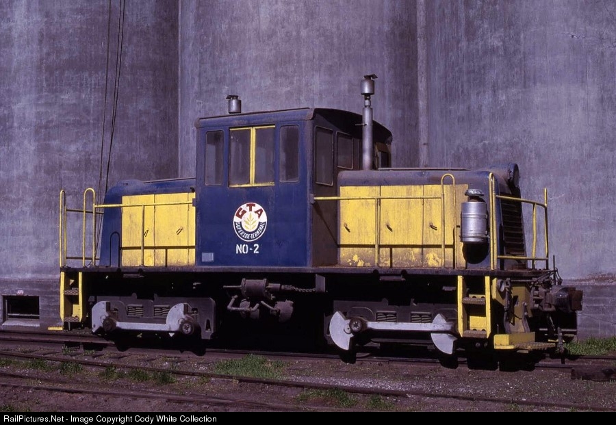 | Farmers Union Grain Terminal Association GE 45 Ton Switcher at the GTA Elevator in Superior WI June 1981. GTA would become Harvest States Cooperatives in 1983 and Cenex-Harvest States Cooperatives in 1998. The current CHS Elevators in Superior are the largest in the Twin Ports with a 18.5 Million Bushel capacity and uses three SW1 switchers, an ex Soo Line SW9 and this 45 Ton switcher to move cars around the facility. Roger Bee Photo from my Collection. |
