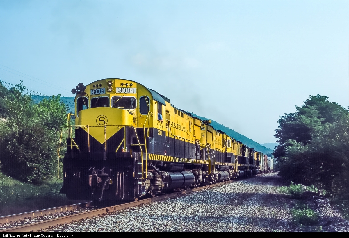 After acquiring its Northern Division, the Susquehanna instituted haulage trains to move freight over trackage rights on the former Erie main line between its two divisions. To get the trains over the road, five ex-Conrail C430’s were purchased and quickly placed in service. Here four of the C430’s and one C420 lead a westbound haulage train, which is rolling to an unscheduled stop at Hale Eddy, New York. I don’t recall whether the problem was train- or locomotive-related, but this train made repeated stops, frustrating photographers who were hoping to get it on Gulf Summit grade and Starucca Viaduct in daylight.