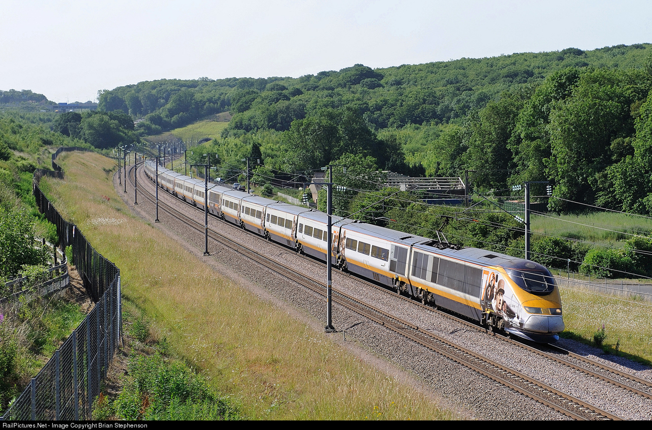 | To-day marks the 80th Anniversary of the appeal made by General De Gaulle to his fellow countrymen to resist on June 18,1940 and broadcast by the BBC on 22nd June following the fall of France. In 2010 Eurostar wrapped one of their trains in a special vinyl for the 70th anniversary and this set, with power cars 3018 and 3017, comes racing down from the North Downs tunnel through the Nashenden Valley to the River Medway bridge forming the 08.07 Paris Nord to London St.Pancras. |