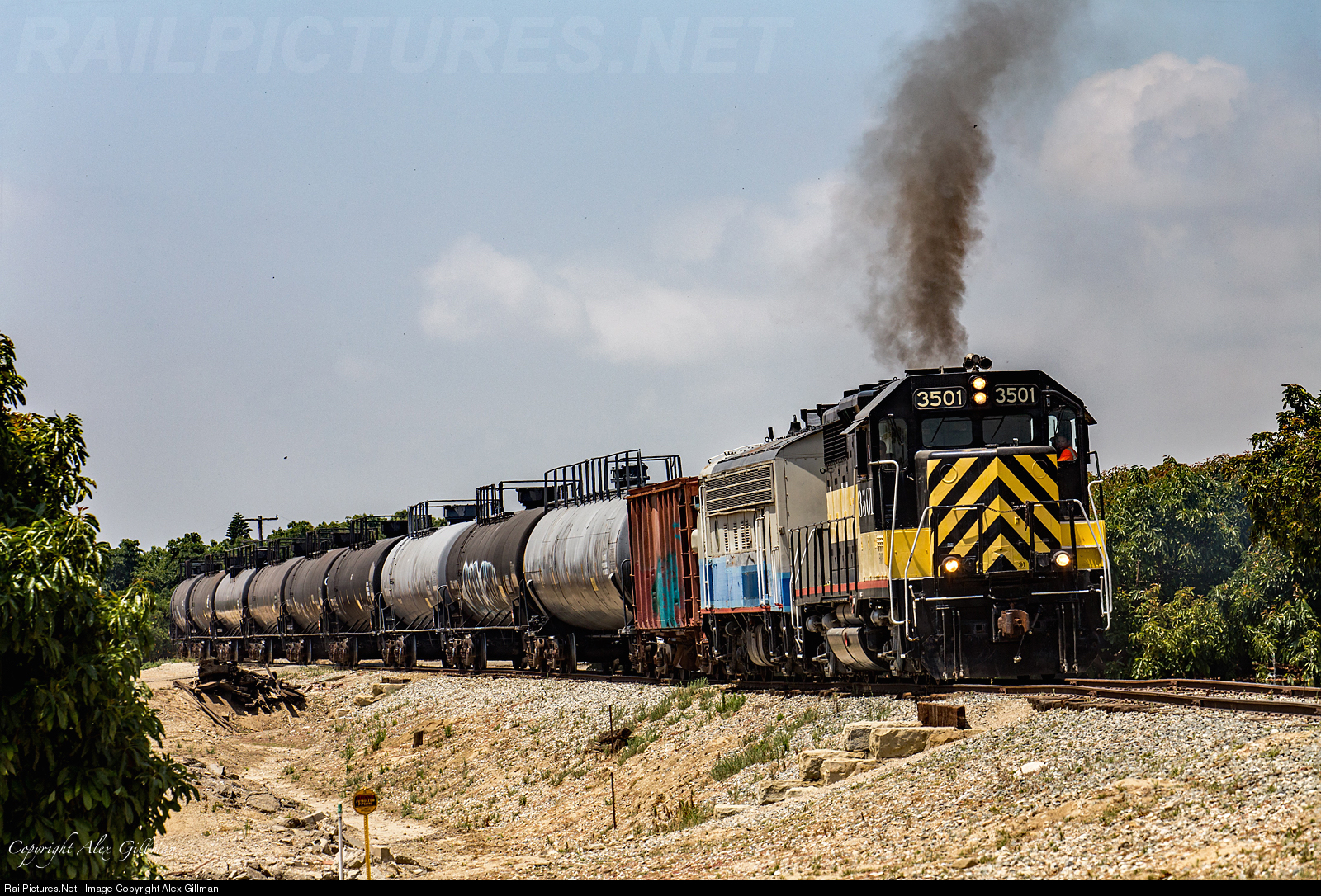Snaking its way east after passing through the Loose Caboose area, Fillmore & Western GP35 No. 3501 puts on a brief smoke show as the engineer notches up the power to bring a train of 10 tank cars (and one buffer car) east.