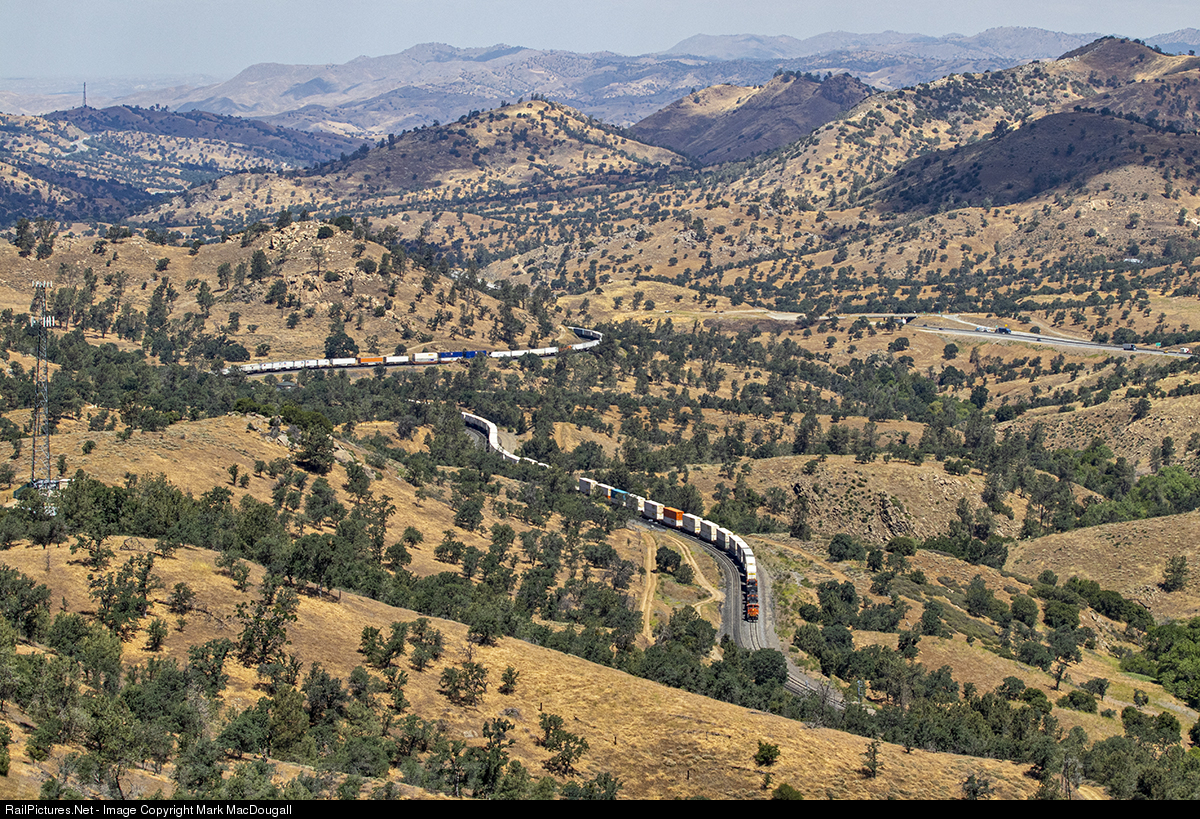 A long intermodal train snakes around the curves as they hold at Marcel for other traffic on a windy morning in Tehachapi Pass.