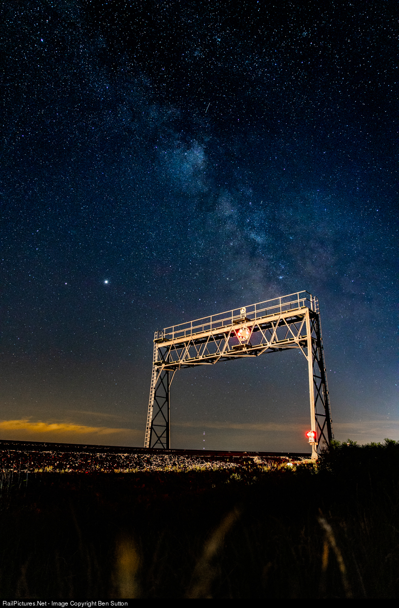 02:05 in the AM. Crickets, other insects, animal noises keep you company as you sit at County Road 3C. Right in front of you is the intersection of Country B, 3 and 3C. Few cars pass by, the occasional old Ford truck seen down the road at one of the many farms of the flat lands of Ohio. Approaching planes still high in the air but more than likely starting their descent into the airport in Toledo north of you. A shooting star or two can be seen. The heavy east and west traffic pounds the diamond at Deshler and sounds like you're sitting right at the crossroads of the north, south, east and west. A crackling radio and hear Q351 clear the Southwest Wye of the diamond at Deshler after the crew was notified their recrew van will be waiting for them at South Deshler. Time to get up, turn the camera on, focus. The edge of our existence staring at you behind a set of stop indications on the B&O signal bridge and on the dwarf signal. They come across the diamond, slowing down, giving some light against the B&O signal bridge. The shutter opens for a few seconds and quickly closes as you capture: South Deshler Galaxy.
