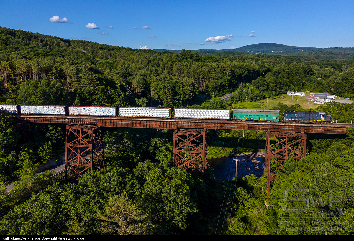 Genesee & Wyoming's New England Central Railroad train 601-19, the White River to Bellows Falls, VT turn job that also works Crestwood LPG in Claremont, NH and a lumber distributor in Charlestown, NH, is seen crossing the Sugar River Trestle near Claremont Junction, NH on June 19. The train is led by veteran ex-FEC turned NECR GP40-2 437.