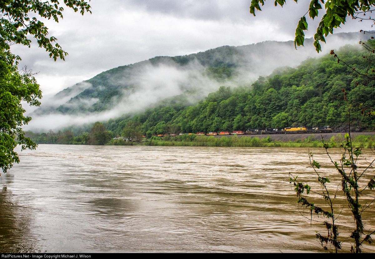 Dense fog hugs the mountains lining the New River near Rich Creek, VA as Norfolk Southern 9555 heads west to Bluefield, WV with an intermodal train on the morning of May 23, 2020. For the past week, large amounts of rainfall had caused the New River to swell to flood levels. Shortly after I left this location, US 460 was shutdown between here and Narrows due to multiple road washouts.