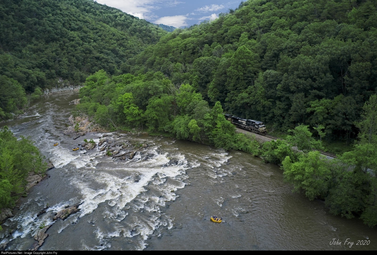 A venerable GE leads the 5 day-a-week manifest from Knoxville, TN to Asheville, NC. This view, about a mile east of Hot Springs NC, catches the train headed upriver past Frank Bell's Rapids, which is normally only seen by rafters and train crews because of the remote location.