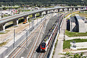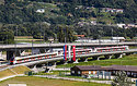 | Pantograph test run through the 15 kilometer long new Ceneri Base Tunnel (CBT) near the north portal of Camorino in the Magadino plane. 3 coupled "Flirts" in multiple control forming a 255 meter long train with 28 double sliding doors on each side. RABe 524 # 301 for TÌLO, RABe 523 # 105 and # 104 of the SBB for the RER Vaudois around Lausanne are entering the tunnel.. |
