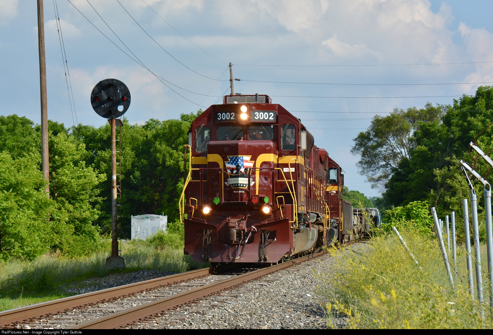 | LIRC 3002, in a PRR-inspired paint scheme with a logo saluting our veterans, leads the Z550 north through CP Dale. |