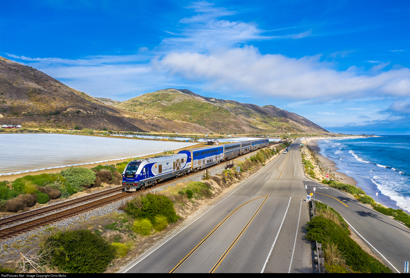 Northbound Pacific Surfliner No. 777 with an Amtrak Sightseer Car in the consist rolls along the Pacific Coast Highway and the beach at Seacliff siding.