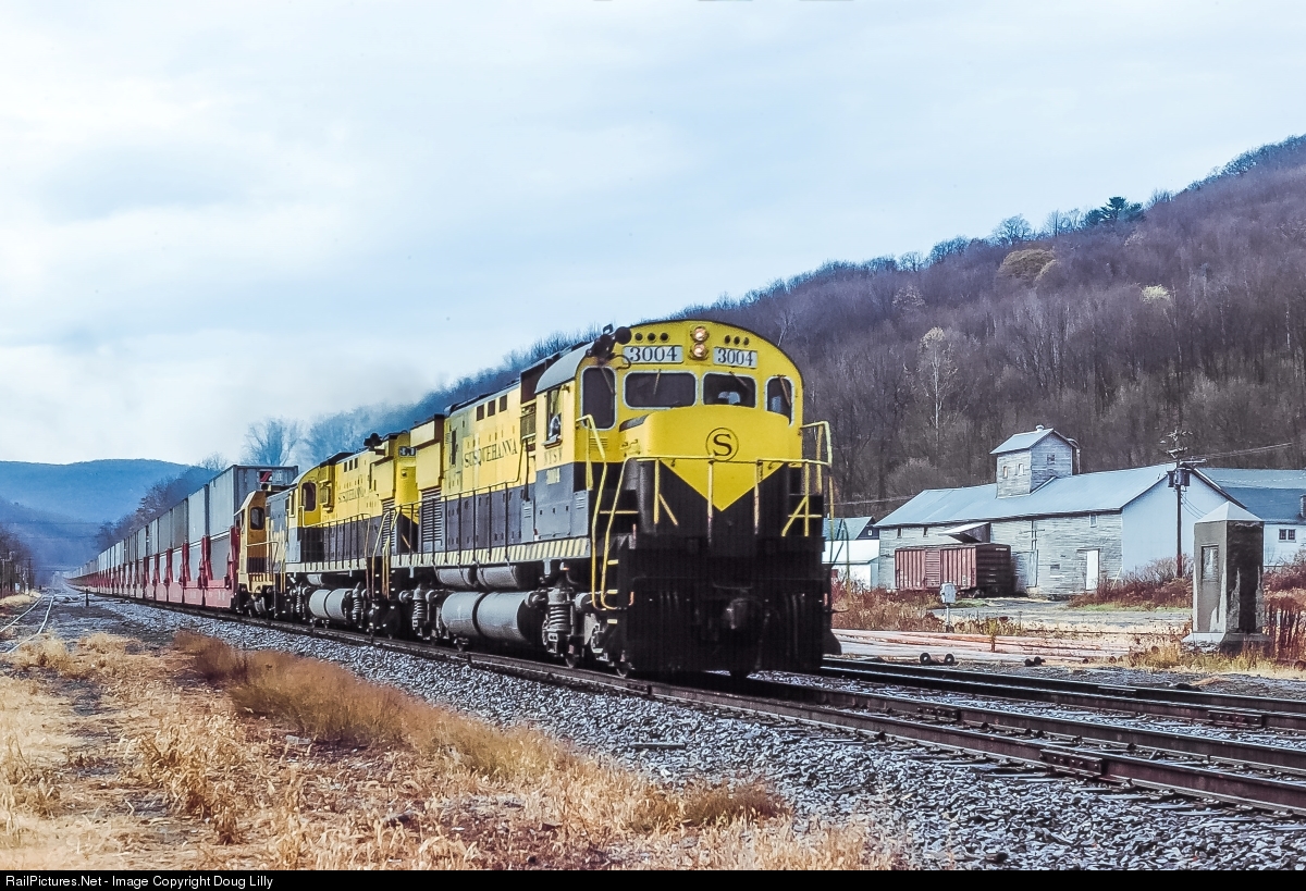Eastbound Susquehanna train NTV-4 drops into Deposit, New York behind two C430’s and a CF7. NTV-4 was one of the first stack trains to come to the east coast.