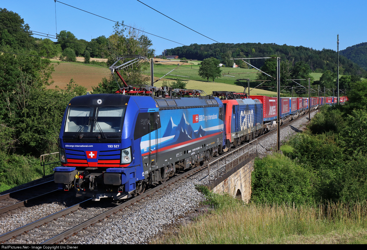 | The SBB Cargo International locomotives 193 527 and Re 474 013 leading a southbound intermodal train on the Bözberg north ramp. |