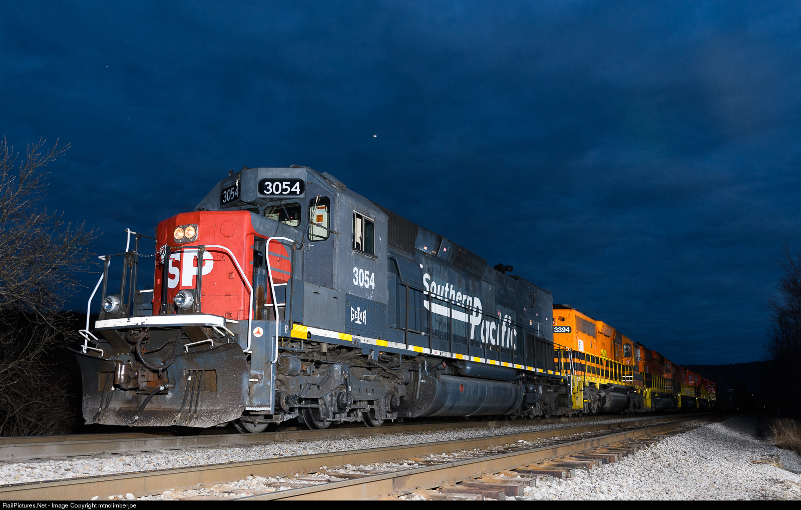 | Former Southern Pacific SD45T-2 sits quietly on an April evening in Bradford, Pennsylvania. Buffalo & Pittsburgh northbound X-COAL is tied down on the main awaiting the journey to Buffalo in the morning with a fresh crew. |